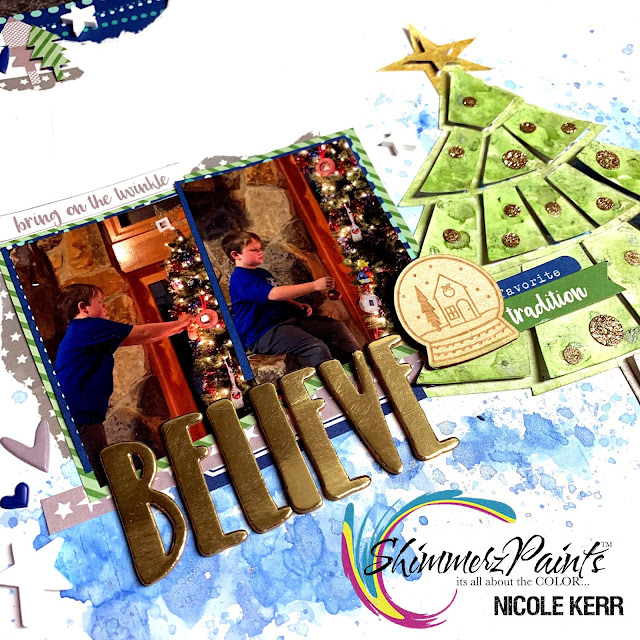 Lately, I've been on a non-traditional Christmas kick. Don't get me wrong, I love red and green, but sometimes I like something a little different. Today, I have "different" for you! I used a tree cut file and six different Shimmerz products on this layout. I first began by creating my background using Vibes Frost Bite, which has the most beautiful gold glitter in it, and Spritz Sapphire. I used the packaging technique on a gessoed background and set it aside to dry. While drying, I cut my tree. I left it on my cutting mat while I did all of the painting. It was so much easier and it didn't harm my mat at all! I added gesso first, then layered Inklingz Greener Pastures and Honey Do List for the branches, Shimmerz Precious Metal for the trunk and Shimmerz Christmas Cheer for the star. While all of my layers were drying, I started building my photo layers and added the top bits to my spread. I used a collection from Elle's Studio this month for all of my papers and most embellishments. The cut file really did all of the hard work adding interest to the layout! Here are a couple close ups of my final spread: